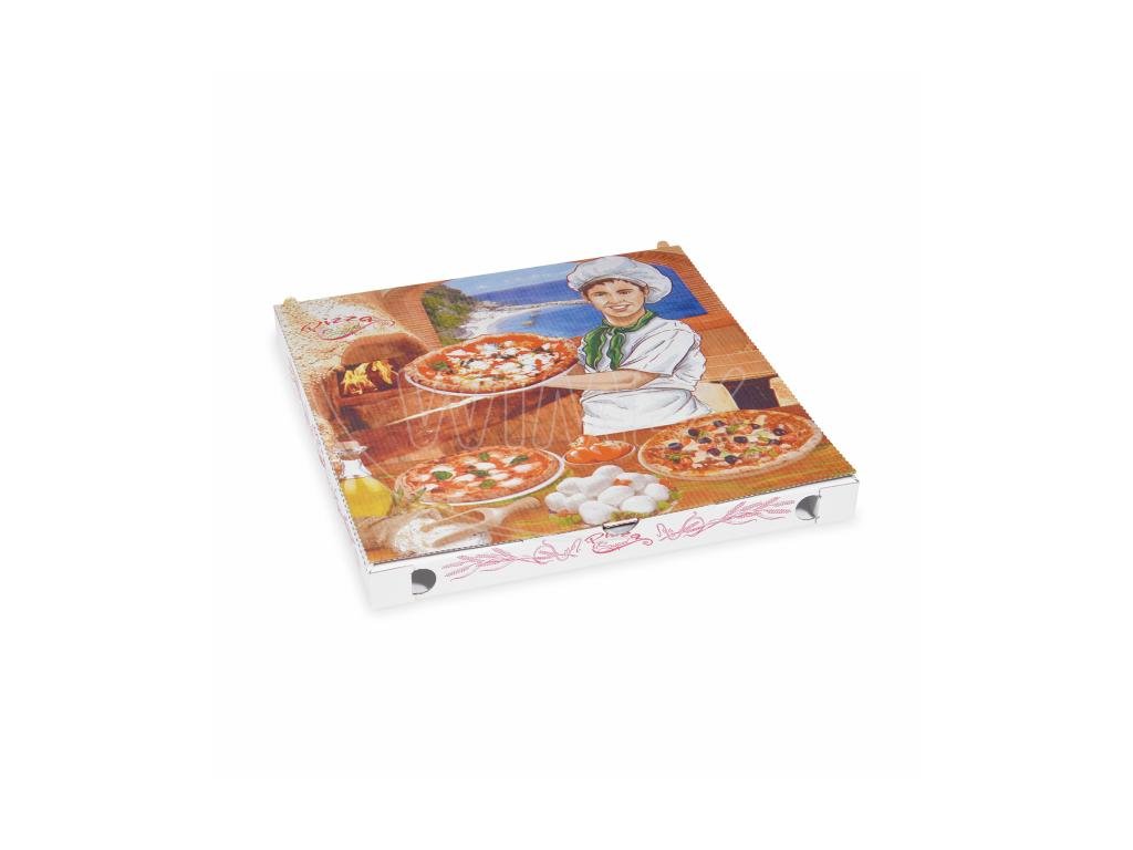Krabice na pizzu (mikrovlnitá lepenka) C4 bílá s potiskem 32,5 x 32,5 x 3 cm [100 ks]Doplňkové parametry