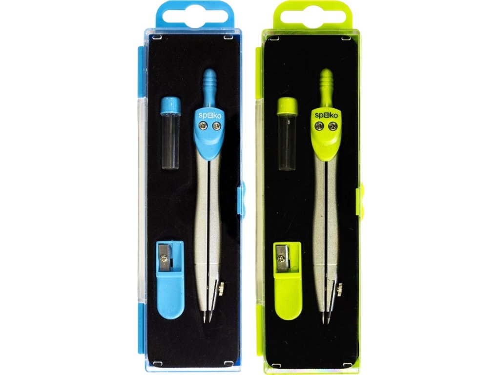 Školní kovové kružítko značky Spoko v praktické plastové krabičce. Sada obsahuje náhradní tuhy a ořezávátko. Ideální pro rýsování kružnic a oblouků v hodinách geometrie.