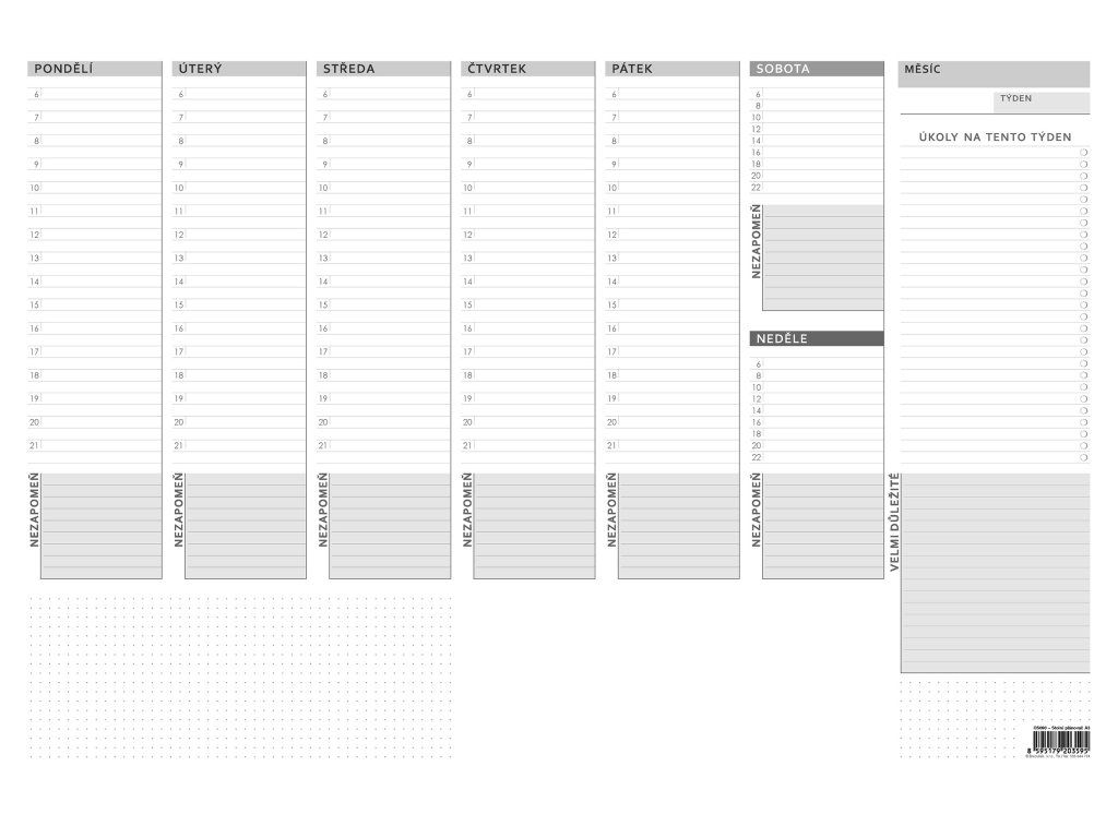 Moderní a praktický stolní plánovač ve formátu A3 s 30 listy. Jednoduchá grafika Vám pomůže efektivně naplánovat Váš týden.